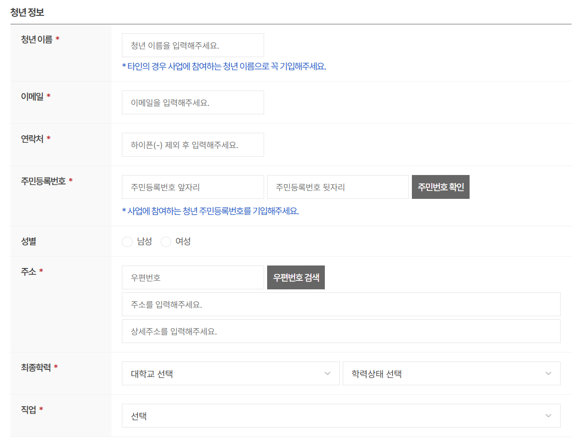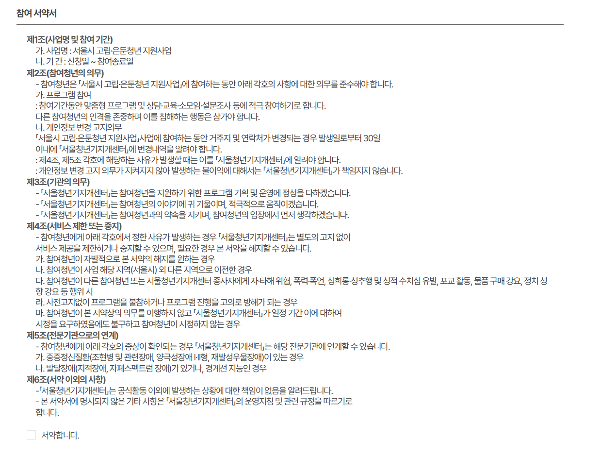 ⑤ 신청자 정보 등록, 청년 정보, 설문 항목, 참여서약서 작성 및 서약 후 신청접수 클릭