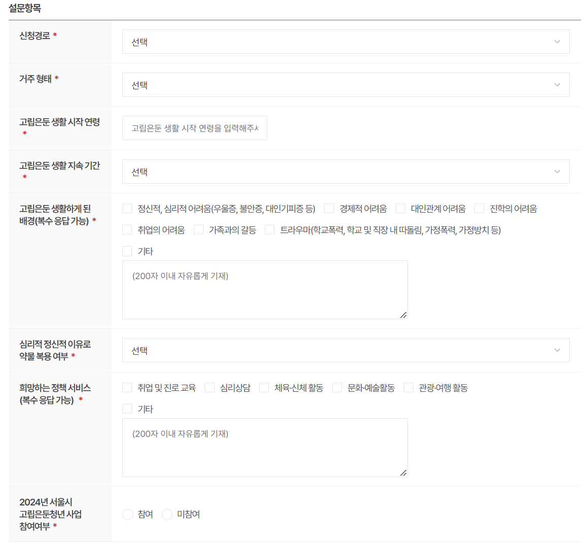 설문항목에는  고립은둔 생활하기 시작한 연령부터, 생활 지속 기간,
