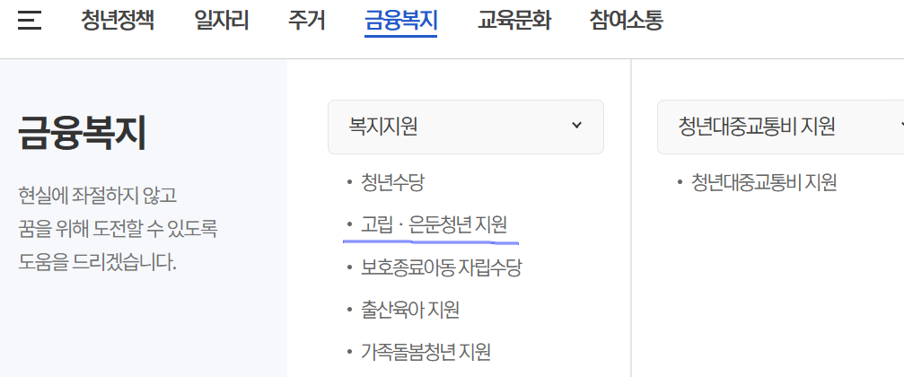 ② 좌측 상단 메뉴에 '[금융복지]>[복지지원]>[고립은둔청년지원] 클릭